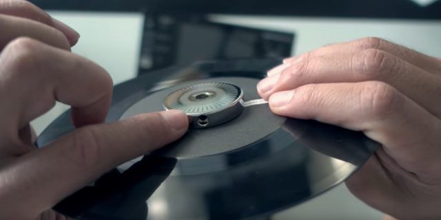 The vinyl plate has the same 45-adapter-style locking mechanism to attach the vinyl to the spindle that you see in the Twelves or the NS7. Additionally, there are some metal pegs that the platter lines up with to lock in the spindle rig which rotates alongside the record. The record is attached to the spindle using an included allen key.
